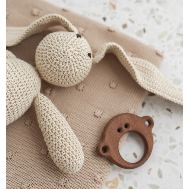 Honey Bunny with a soft Popcorn Blanket and a natural wooden Chunkey Monkey teether, beautifully packaged in a premium gift box—perfect for newborns and baby showers.