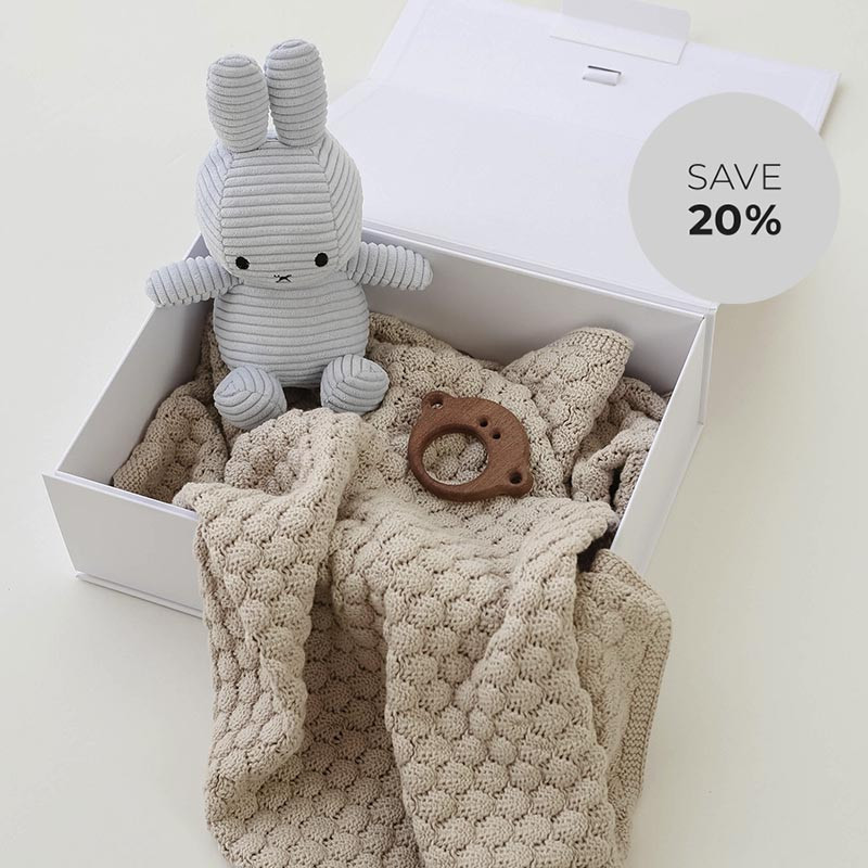 Corduroy Miffy Bunny with a soft Nest Blanket and a natural wooden Chunky Monkey teether, beautifully packaged in a premium gift box—perfect for newborns and baby showers.