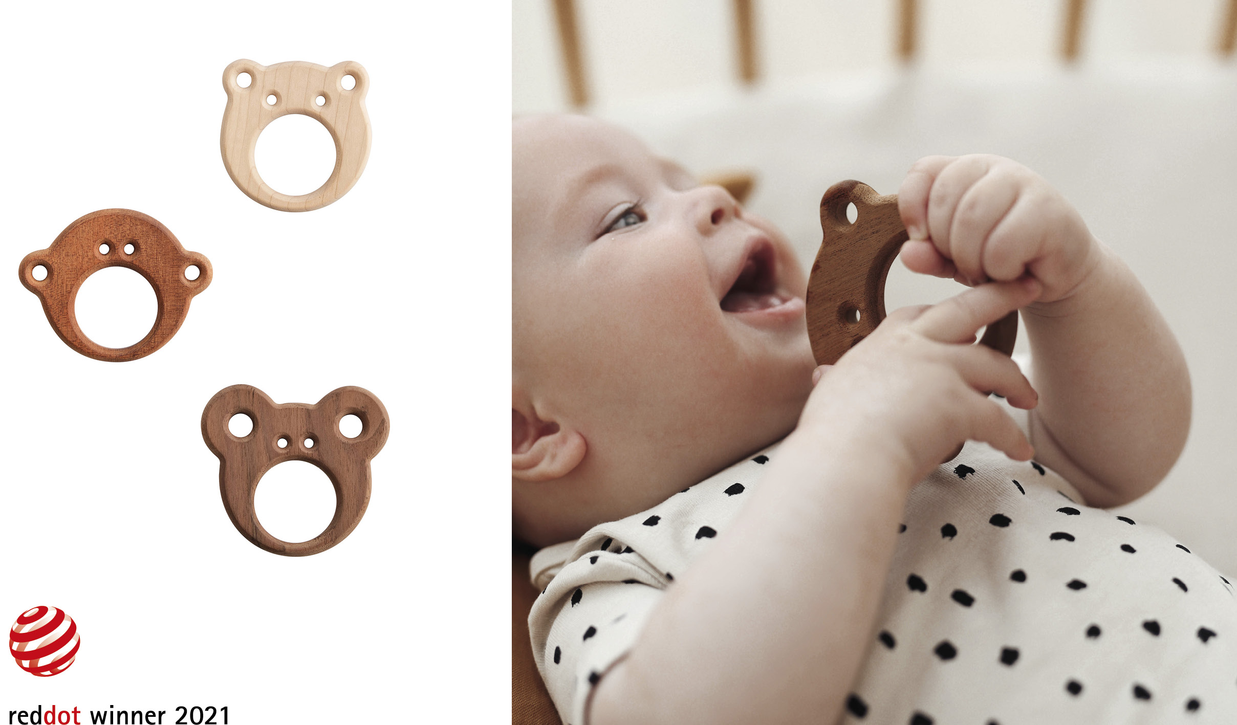 Based on repeating circles used to create different creatures, our wooden teethers sparked enthusiasm in the jury for the Red Dot Product Design Award 2021 for both their eye-catching and simple design and their consistently sustainable concept. They also lauded their natural material and environmentally friendly packaging. Babies love their easy-to-grasp shape, soft edges and recognisable creatures – a bear, a monkey and a frog are ready for adventures!