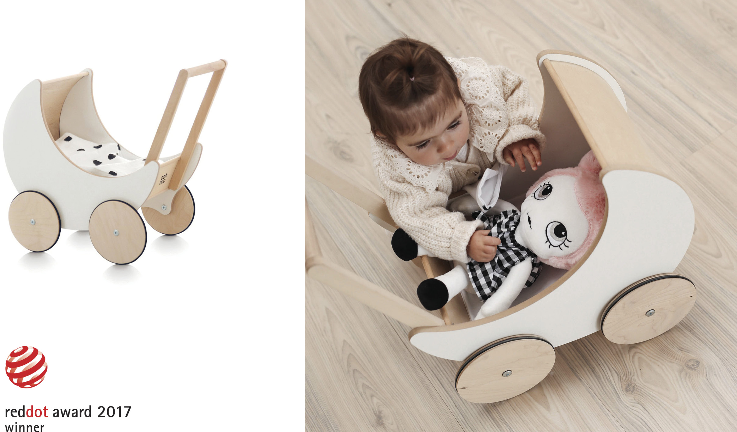 Our Wooden Toy Pram for Dolls has become an iconic modern interpretation of the traditional doll pram. Its contemporary aesthetics harmoniously fit into the modern living environment. In 2017, the Red Dot Product Design Award Jury praised the use of natural materials and its timeless design, which make the ooh noo toy pram a charming interpretation of a doll pram.