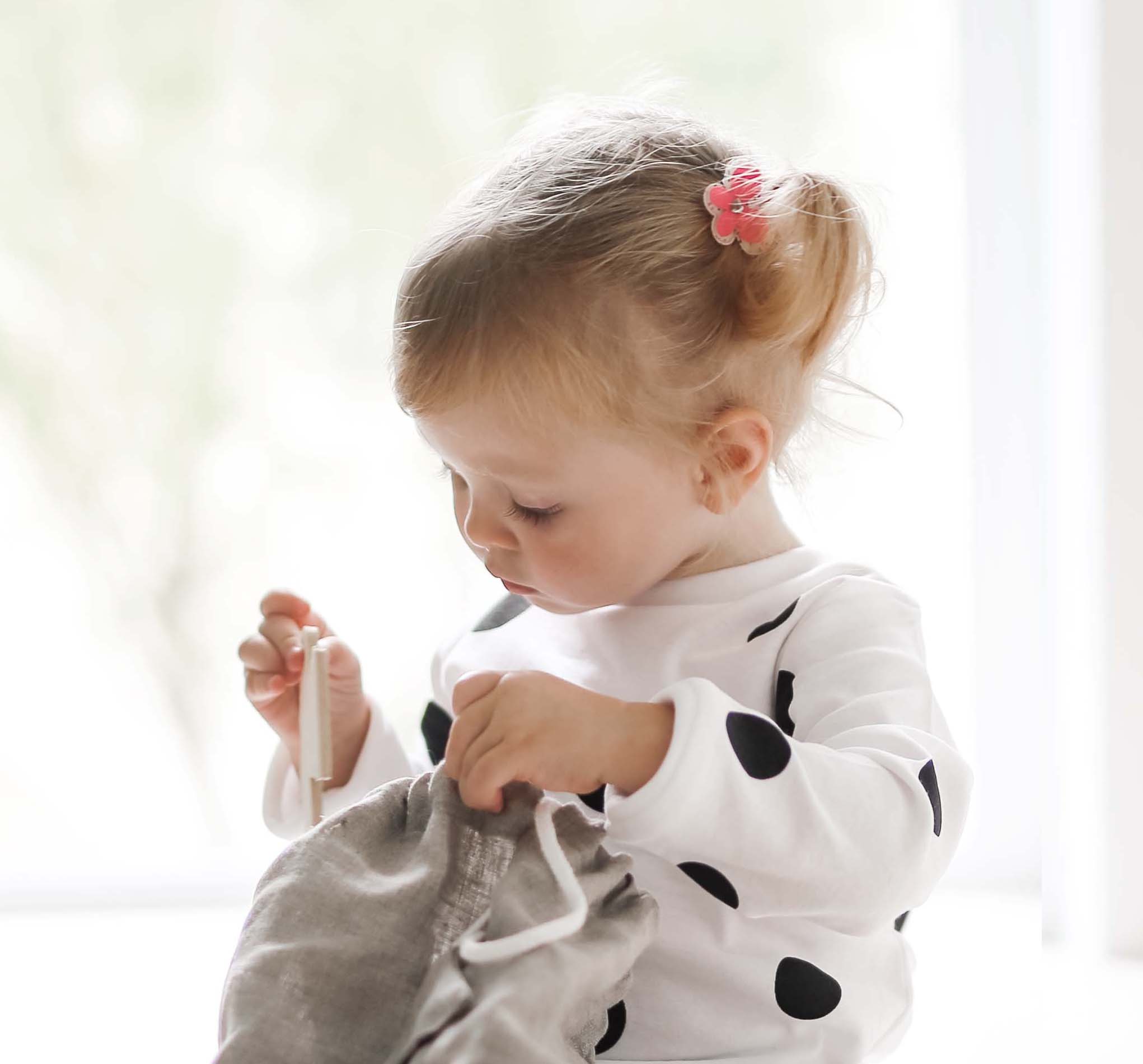 A mystery bag can help develop this skill while having fun. In this activity, a simple cloth bag filled with a few everyday objects becomes a space of endless exploration and learning. After all, toddlers love surprises!