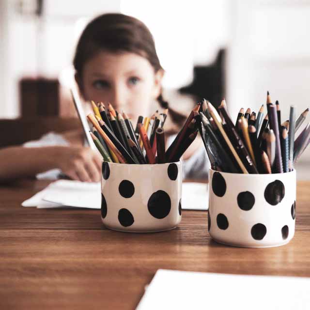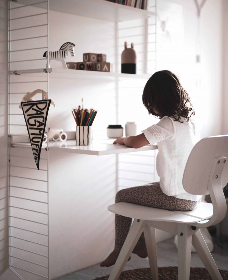 Fortunately, we didn’t have to buy a whole new desk or anything. We just added the desktop extension to our String Furniture wall system. Easy-peasy. String Furniture is so versatile and a must for anyone like me, who loves to constantly experiment with new looks and the placement of items in a room. Little by little, I’ve also been changing out some of her shelf decor. I’m in love with this Ragamuffin pennant from the Oregon, USA, based illustrator and designer Roxy Marj. And the ooh noo ceramic mugs (here in Magnetic Attraction and (an early prototype for our) Freestyle design) make attractive (and monochrome!) pencil holders.
