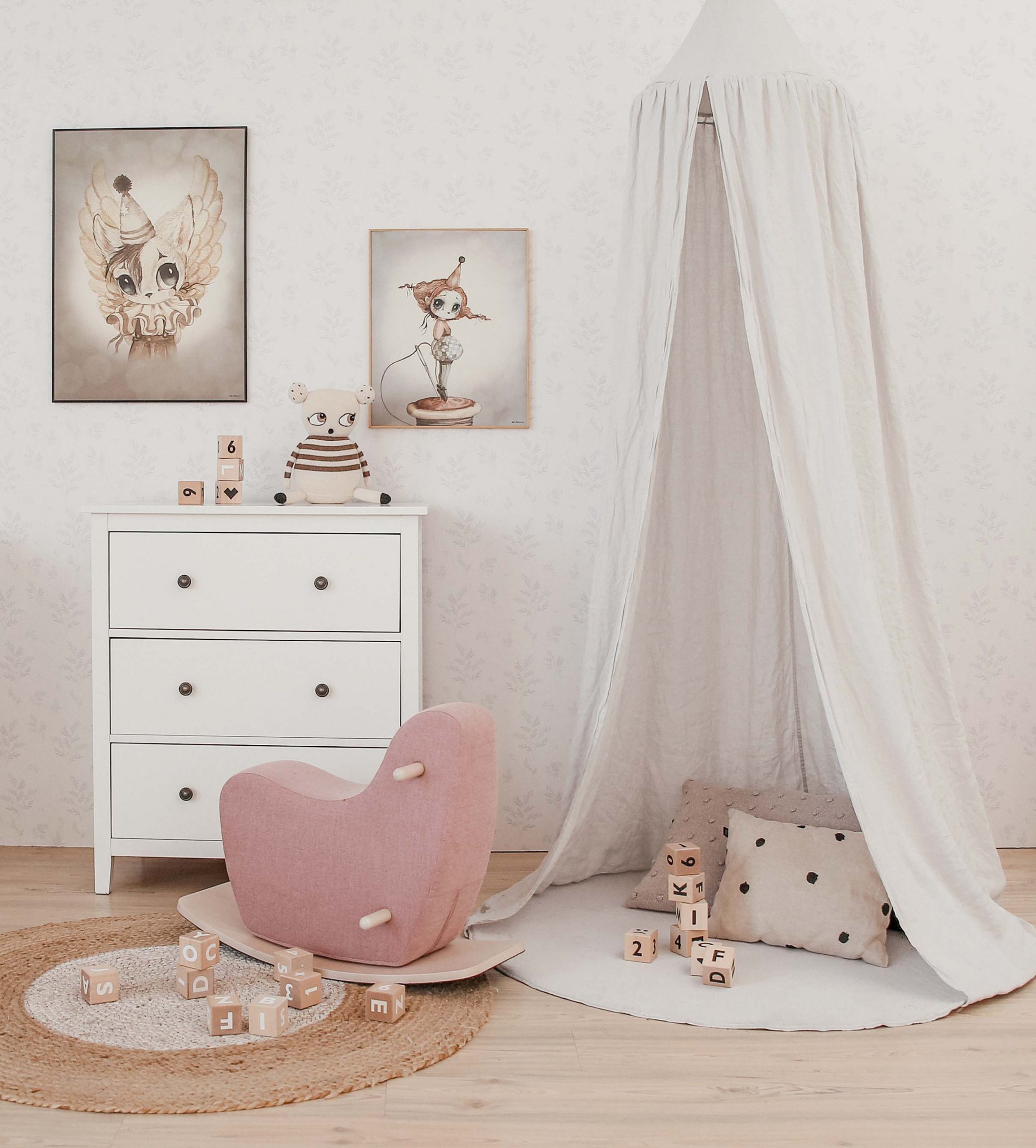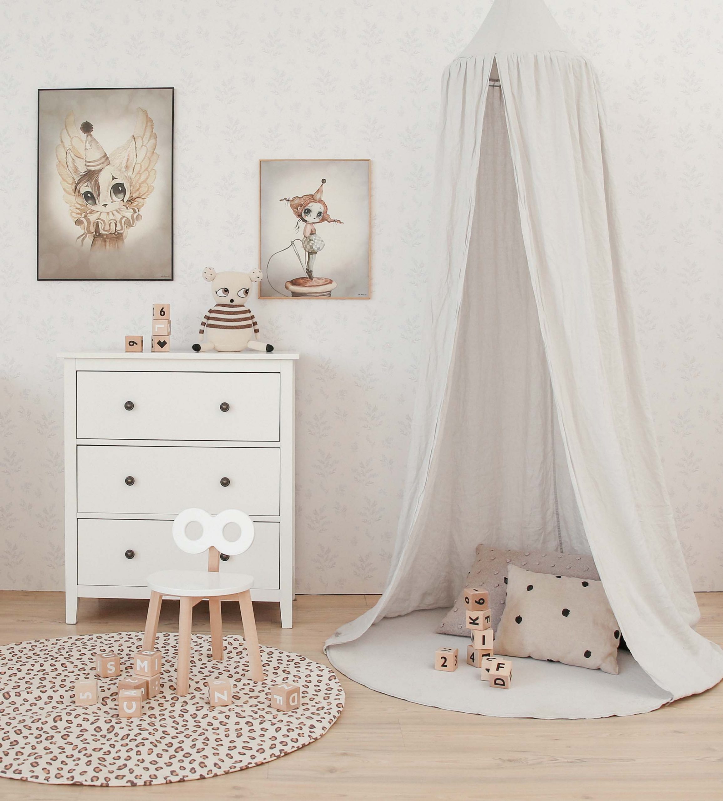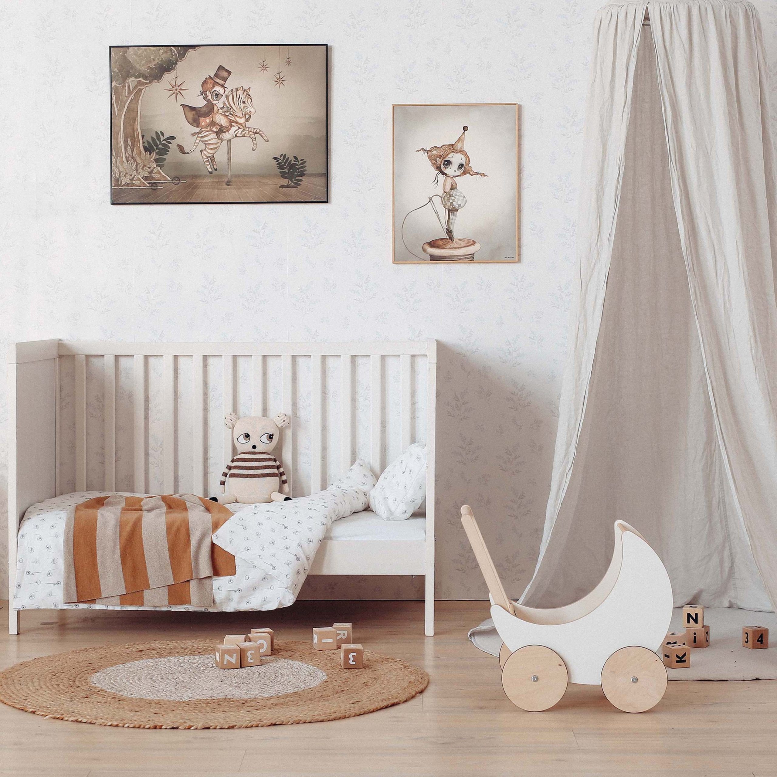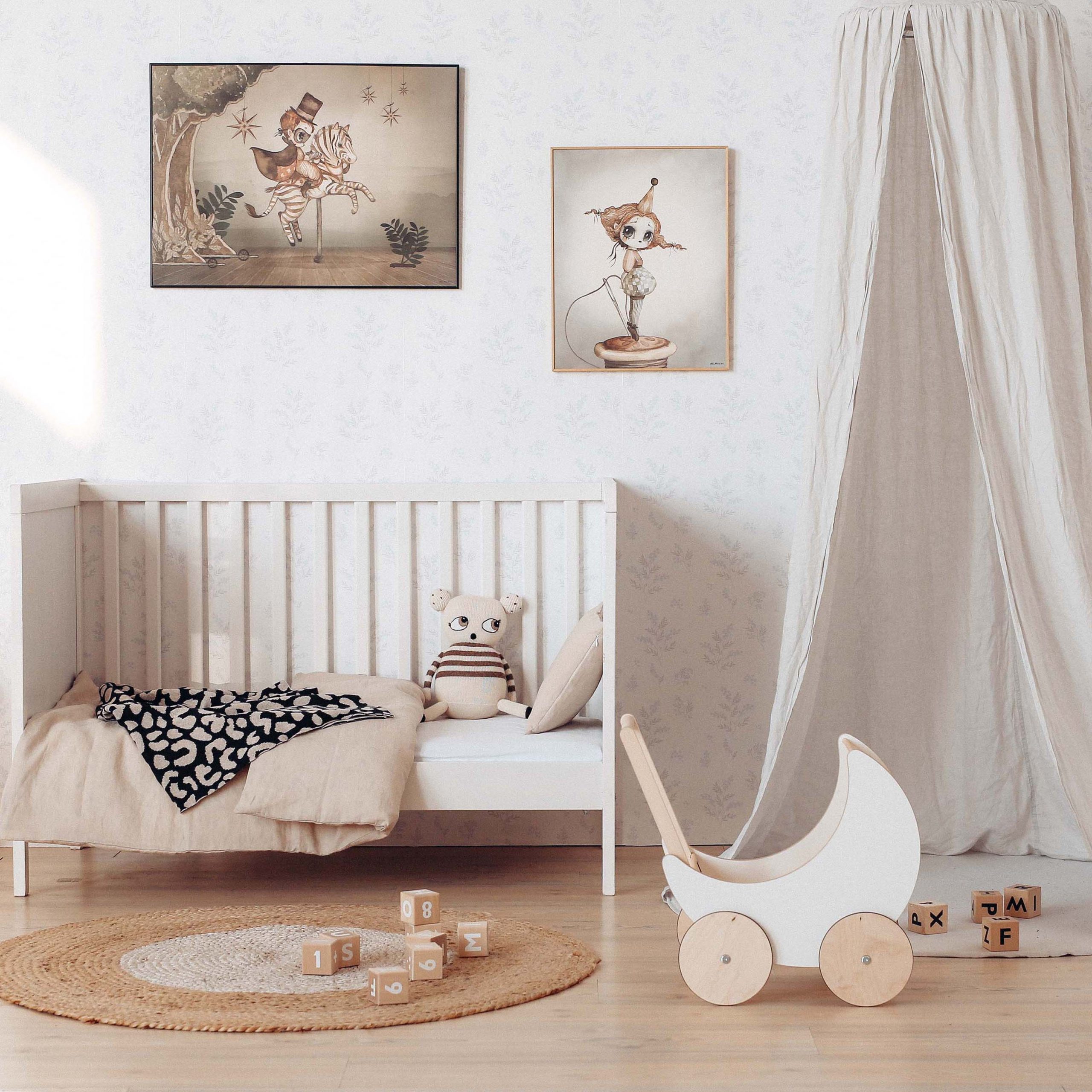 First, we experimented with different colours and patterns of the bedding. It is evident from the photos how the feel of the nursery changes. Since the wallpaper is very subtle and light, we decided for a more neutral colour palette. In the first photo, we added a stripy blanket which contrasts the overall mild tones of the room. The bold leopard print of the blanket in the third photo amps up the room.